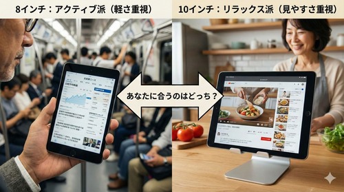 もしあなたが、普段はパソコンを使っていて、**「移動中や隙間時間に使いたい」**と考えているなら、8インチ(iPad miniサイズなど)が最強の相棒になります。
